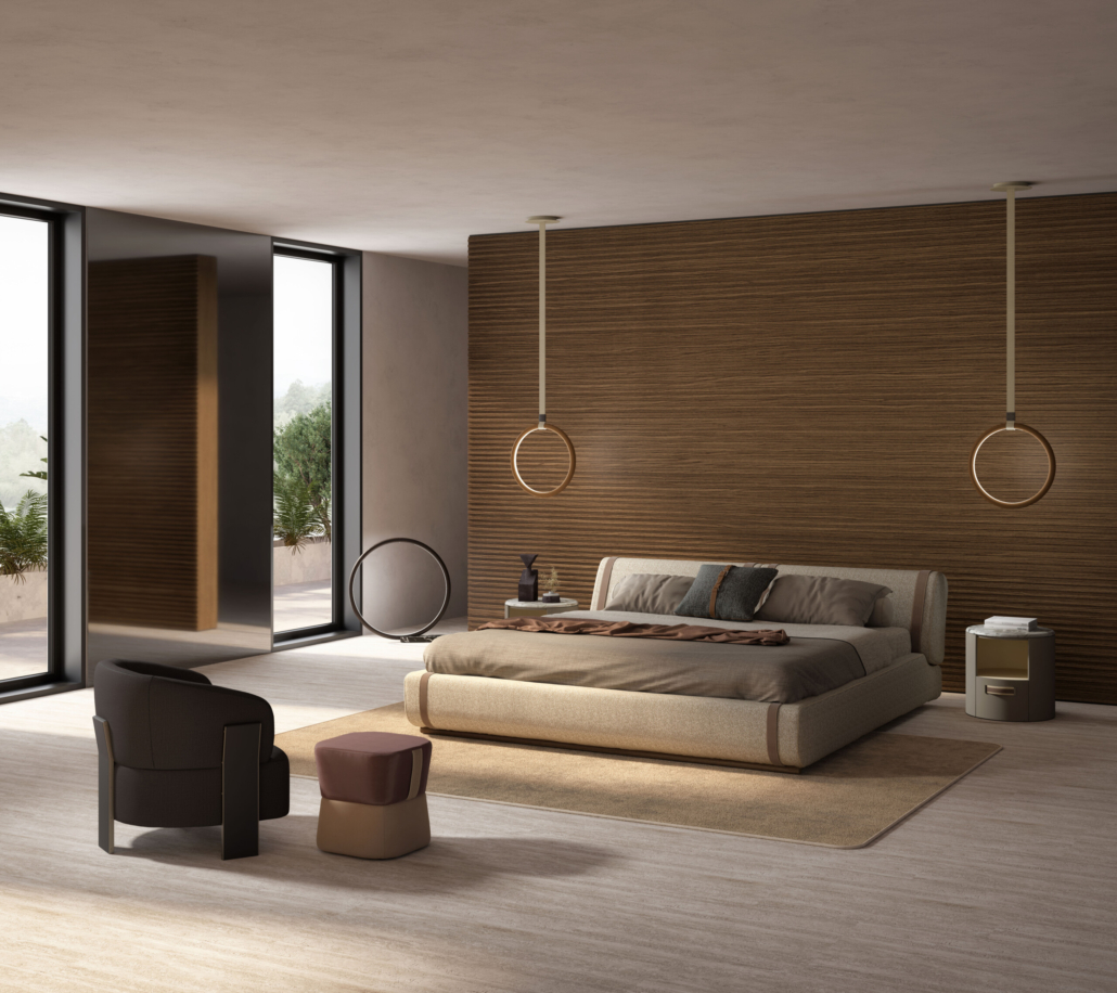 Caratterizzato da un design avvolgente e da una testata strutturata in due volumi distinti, il letto Ponente incarna una visione contemporanea dell’abitare. I profili metallici ne sottolineano la silhouette sinuosa, esaltando la maestria sartoriale di Meroni&Colzani.