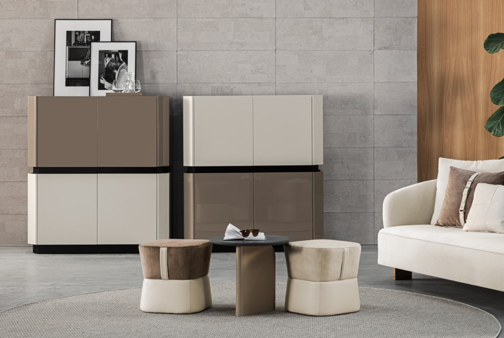 Il pouf come dolce aggiunta a un angolo salotto, conferisce un’atmosfera morbida e accogliente a qualsiasi spazio. Rivestito in pelle e tessuto, la base è divisa dalla seduta da un particolare restringimento della forma. Un piano imbottito consente di utilizzarlo come tavolino d’appoggio o seduta informale.
