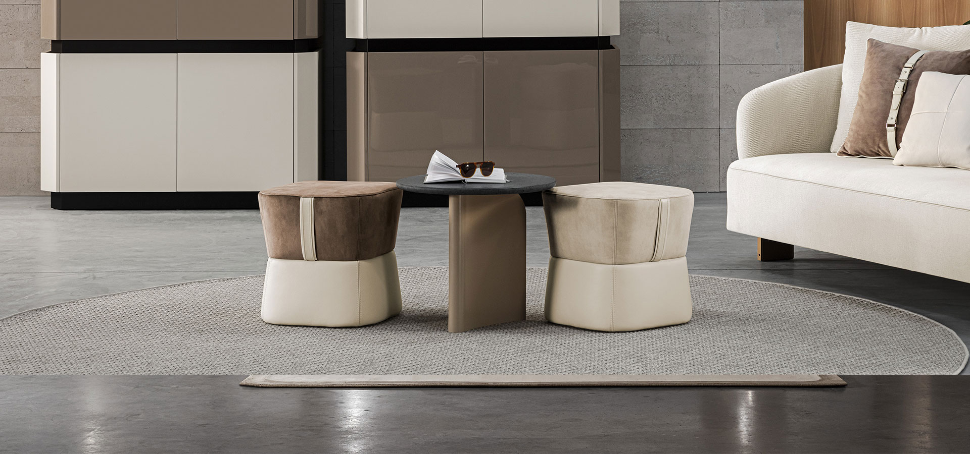 This ottoman serves as a graceful addition to any living area, creating a warm and welcoming ambience. Covered in leather and fabric, the base is separated from the seat by a design that narrows towards the centre. The padded top allows it to be used as a table or an informal seat.